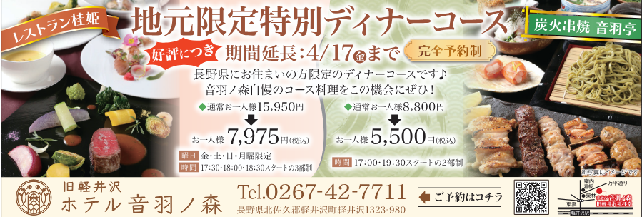 レストラン「桂姫」でのフレンチ、隠れ家的な「音羽亭」での和食・炭火串焼きは、特別な日だけでなく、日頃からお気軽にお立ち寄りください。