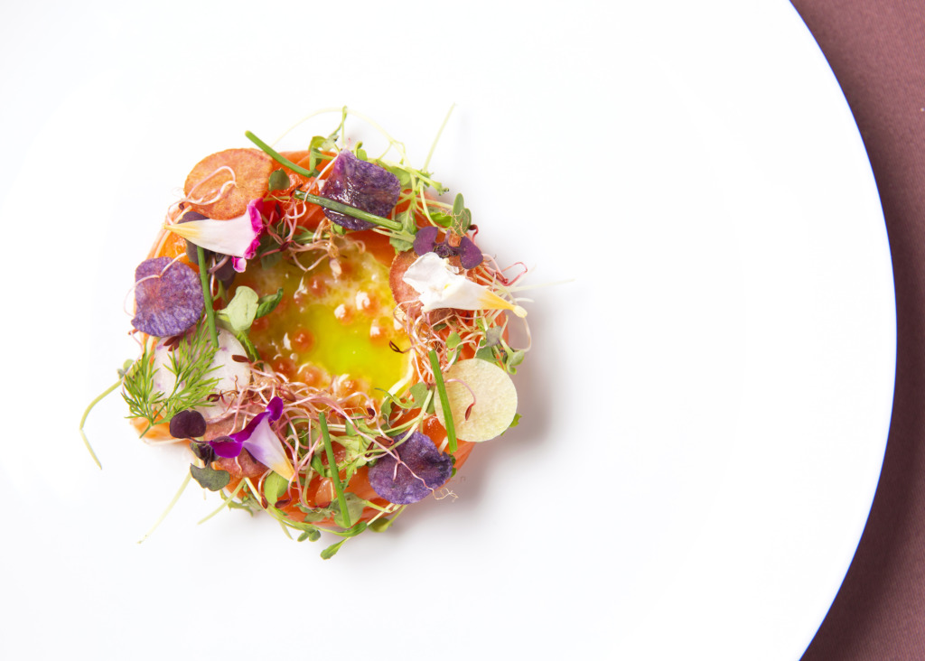 前菜: 信州サーモンのリース仕立て ゴールデンキャビアといくら添え